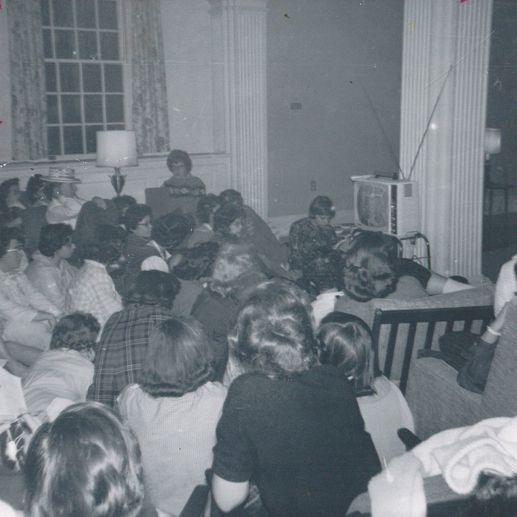 Students watching election coverage on a television in one of the dormitories, 1960.