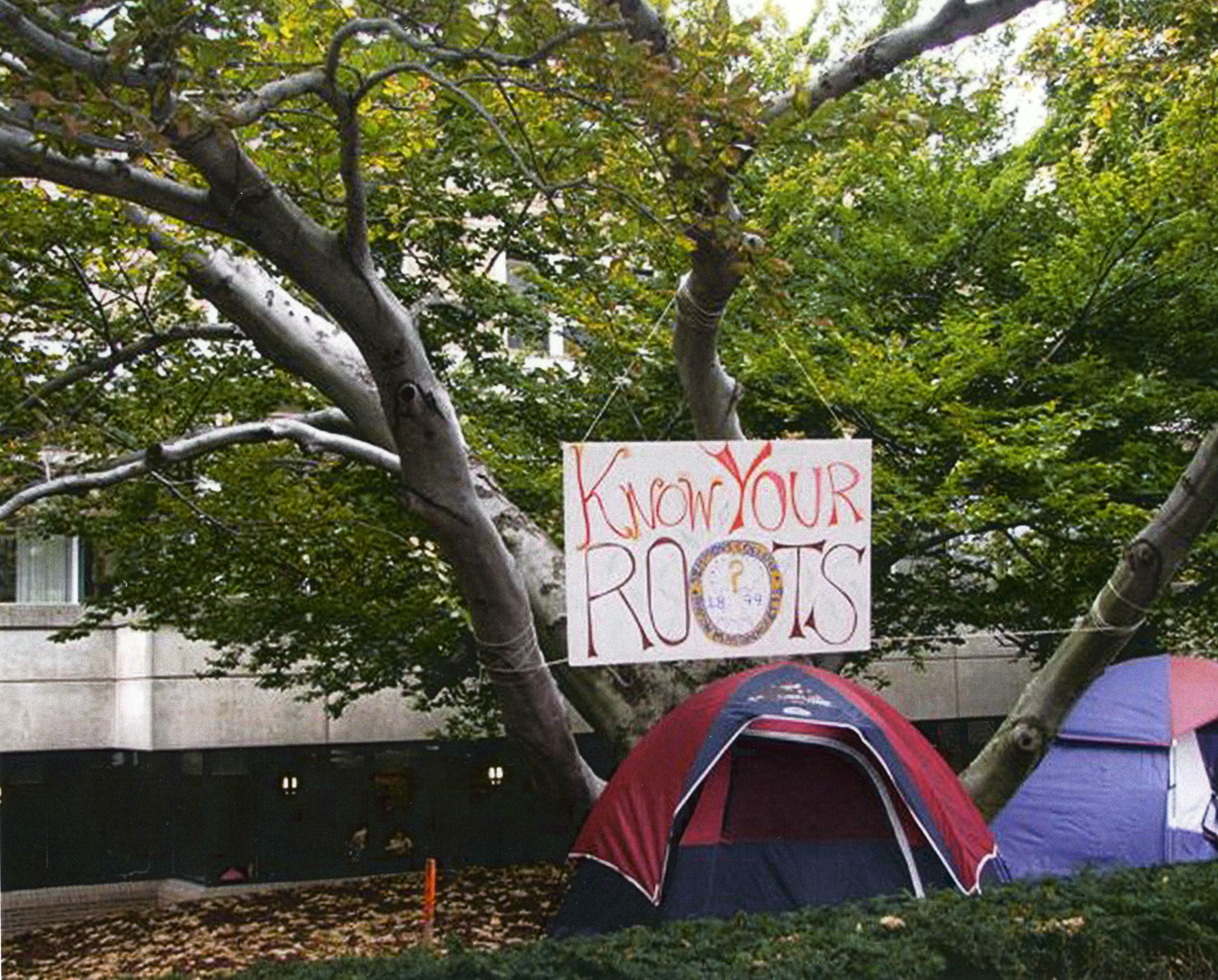 A 'Know Your Roots' sign hung from one of the beech trees behind the Main College Building. Tents are set up in front of the base of the tree in protest of plans to remove the beech trees for the construction of the School of Management building.
