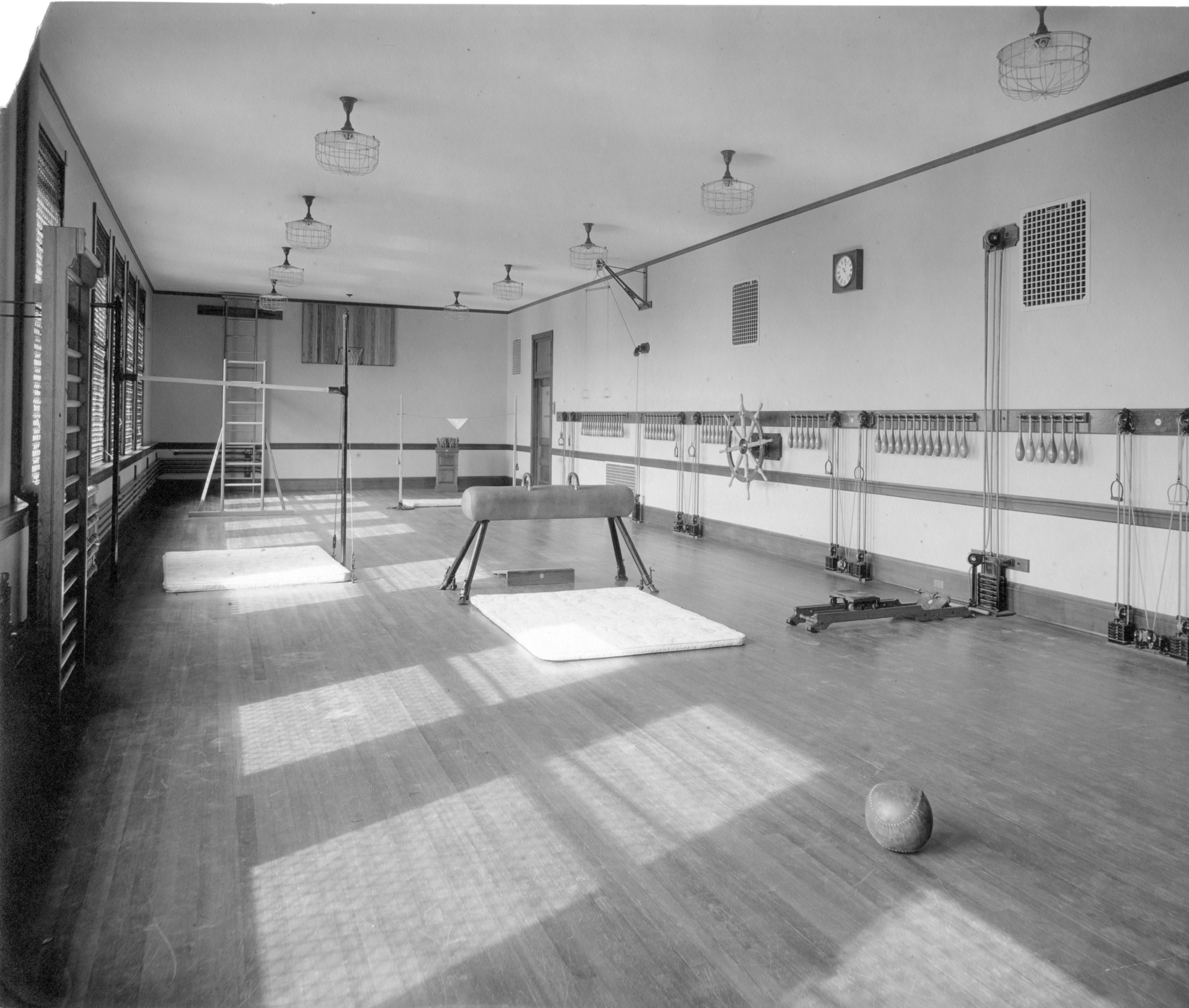 View of the original gymnasium, with a horse and mat in the center of the area. Other equipment is on the wall.