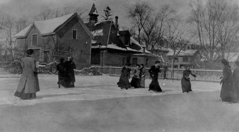 Wolf, Estelle, “Women in long dresses and coats in a snowball fight at Brookline House. On the back of the photo, the label reads "Estelle Wolf 1906-1907, recvd 9/7/76.",” Buildings@Simmons, accessed March 15, 2026, https://beatleyweb.simmons.edu/buildings/items/show/42.