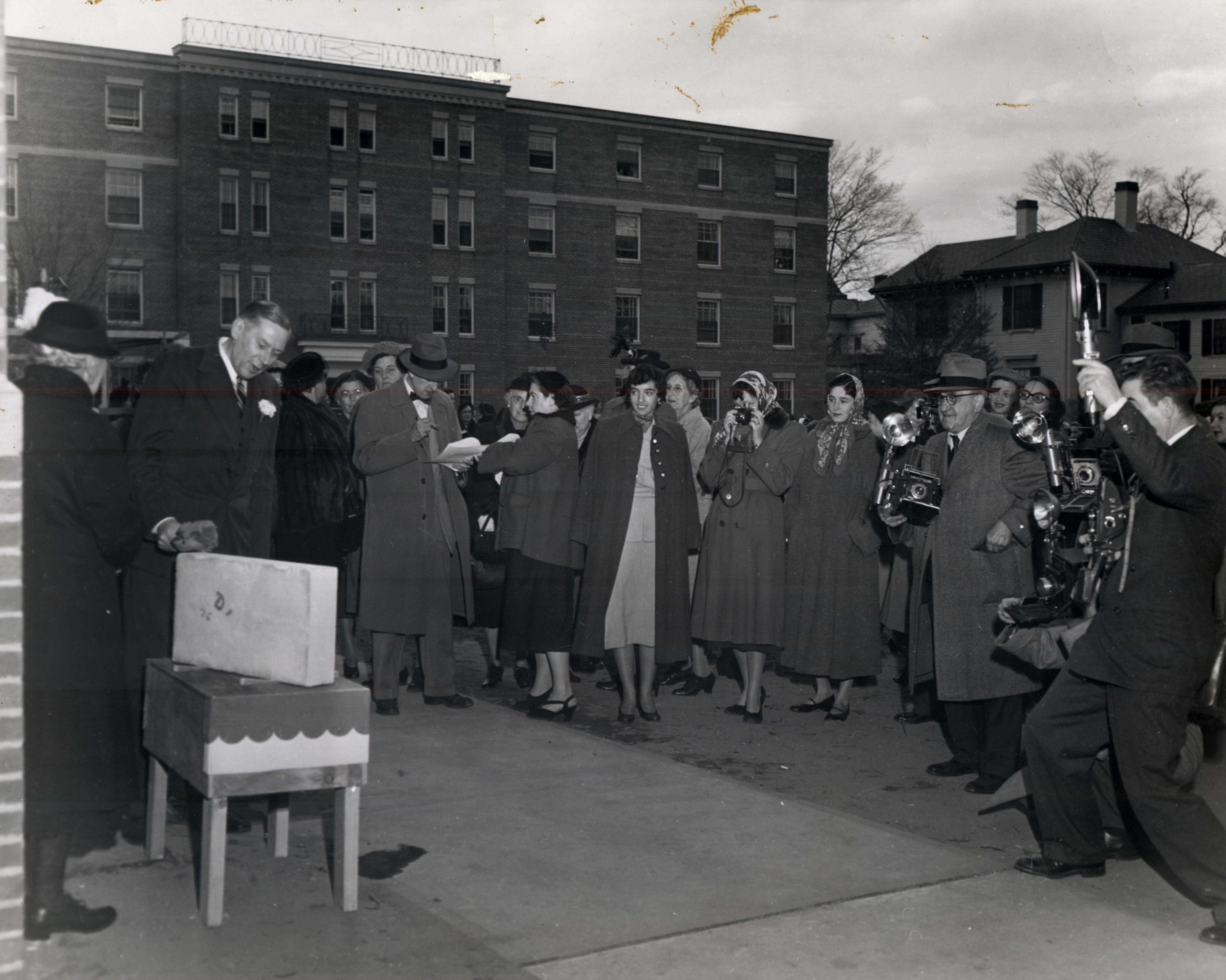 President Bancroft Beatley laying the cornerstone of Bartol Hall as the crowd looks on.