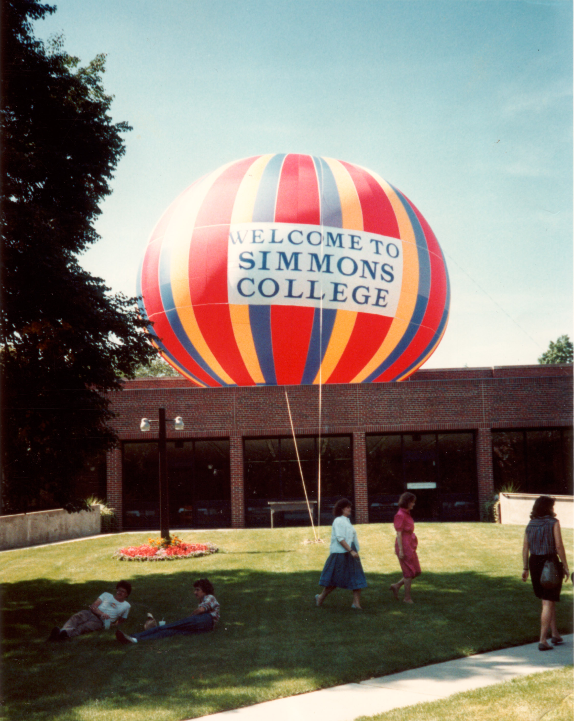 “View of a large, bright striped balloon with 'WELCOME SIMMONS COLLEGE' signage tethered to Bartol Hall, perhaps during orientation in September.,” Buildings@Simmons, accessed March 15, 2026, https://beatleyweb.simmons.edu/buildings/items/show/65.