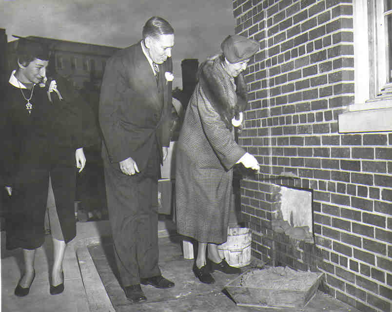 From left to right: Lucille Cofman (Krichmar), Class of 1953, President Bancroft Beatley, and Jessie Gwendolyn Morse laying cement at the dedication of Morse Hall.