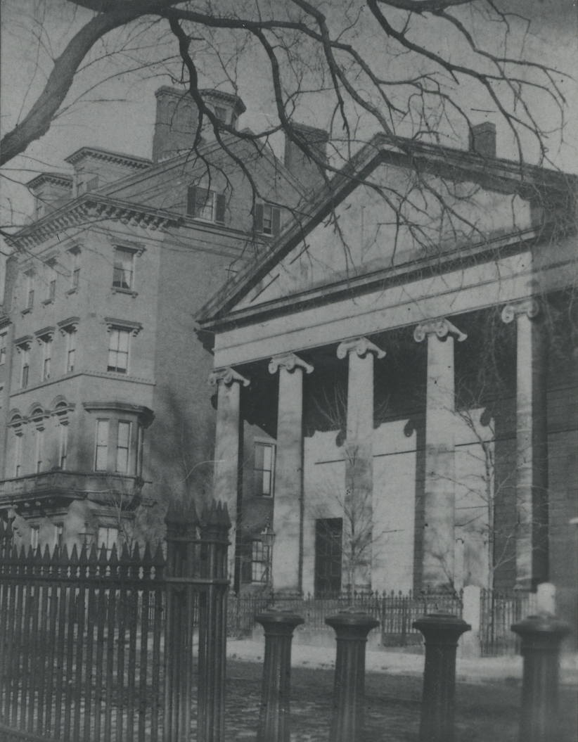 View of the John Simmons mansion on Tremont Street, next to the (Episcopal) Cathedral Church of St. Paul, circa 1865.