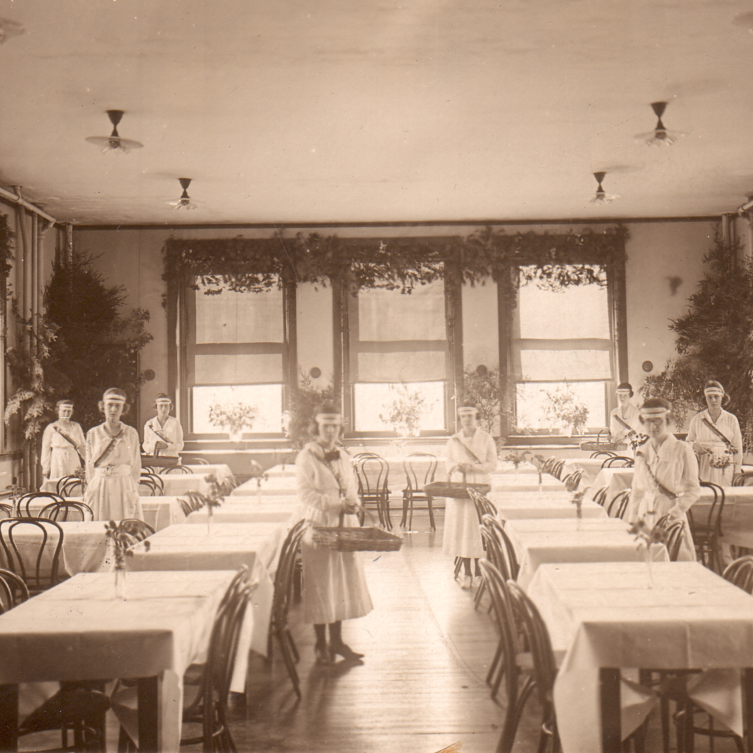 Unidentified students preparing for an Endowment Campaign Tea in perhaps the old Faculty Lounge in the Main College Building. The tables are set with cloths and flowers, circa 1921.