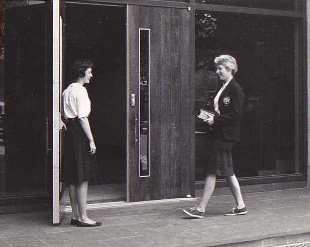 Virginia Belyea, Class of 1963, carrying John Simmons' Bible, the first book to be placed in Beatley Library, as Patricia Yule, Class of 1961, holds the door, 1961.
