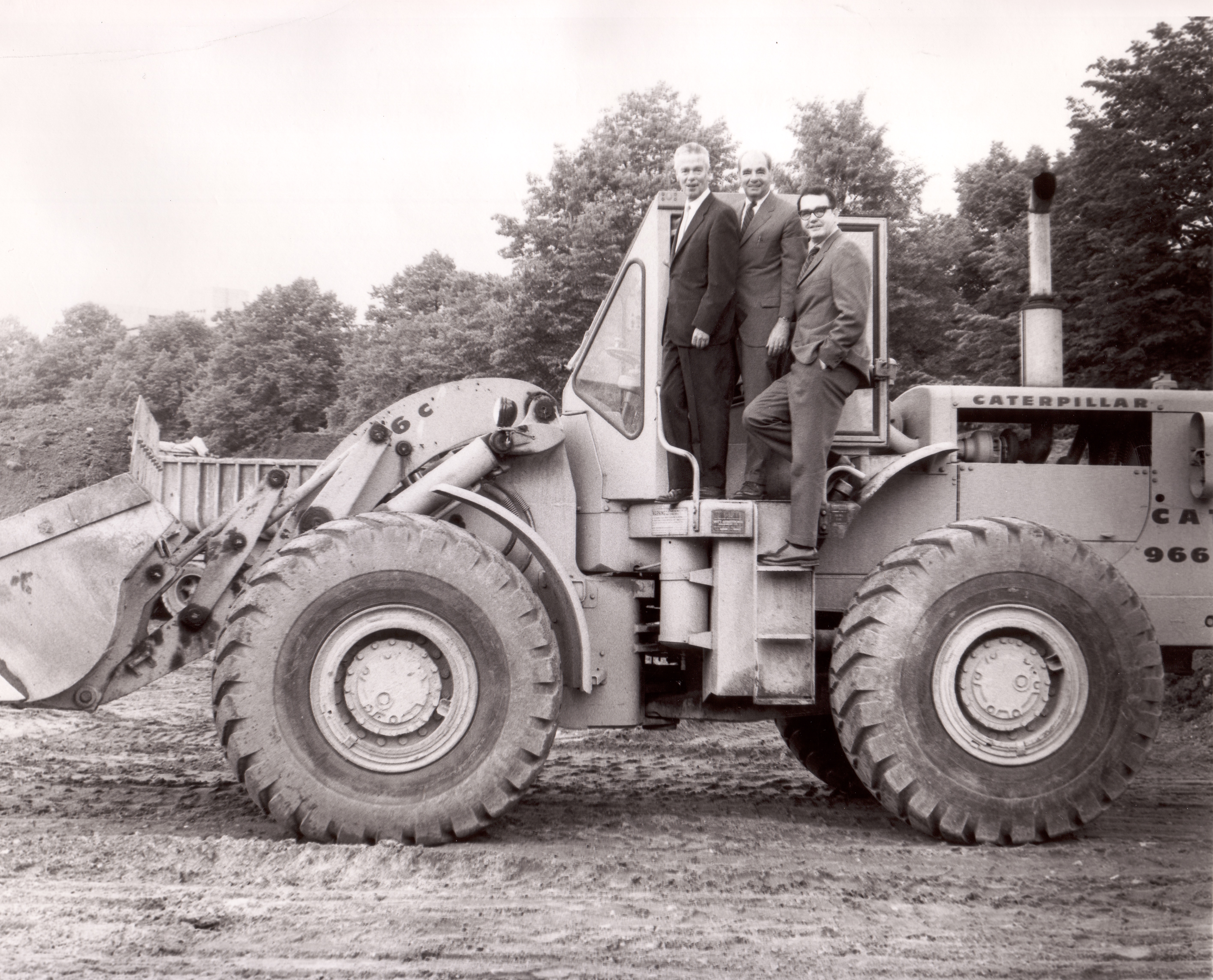 Former President William E. Park and President William J. Holmes posed on a tractor during the construction of the Park Science Center (the third man is unidentified), circa 1971.
