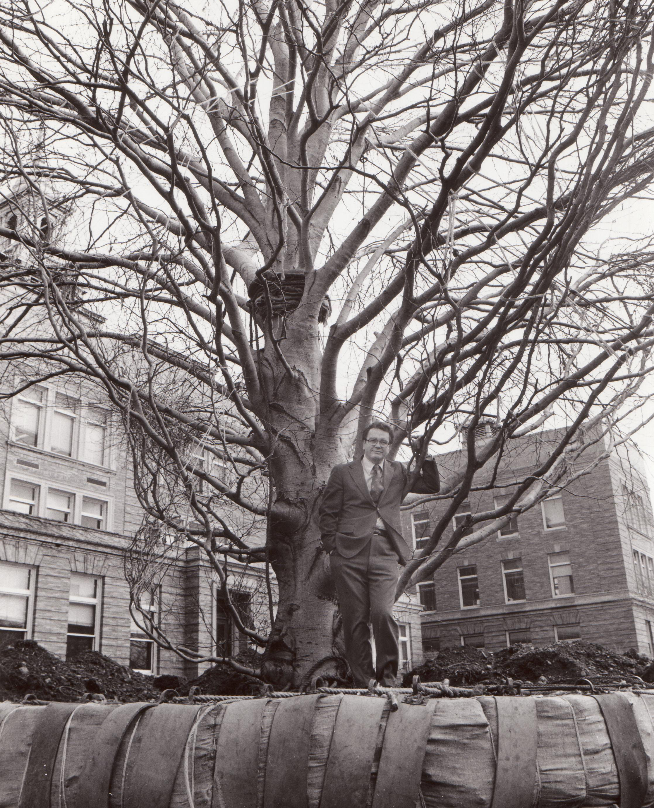 President William J. Holmes standing "in" a large beech tree as it is being prepared for moving prior to the construction of the Main College Building's rear patio, circa 1978.