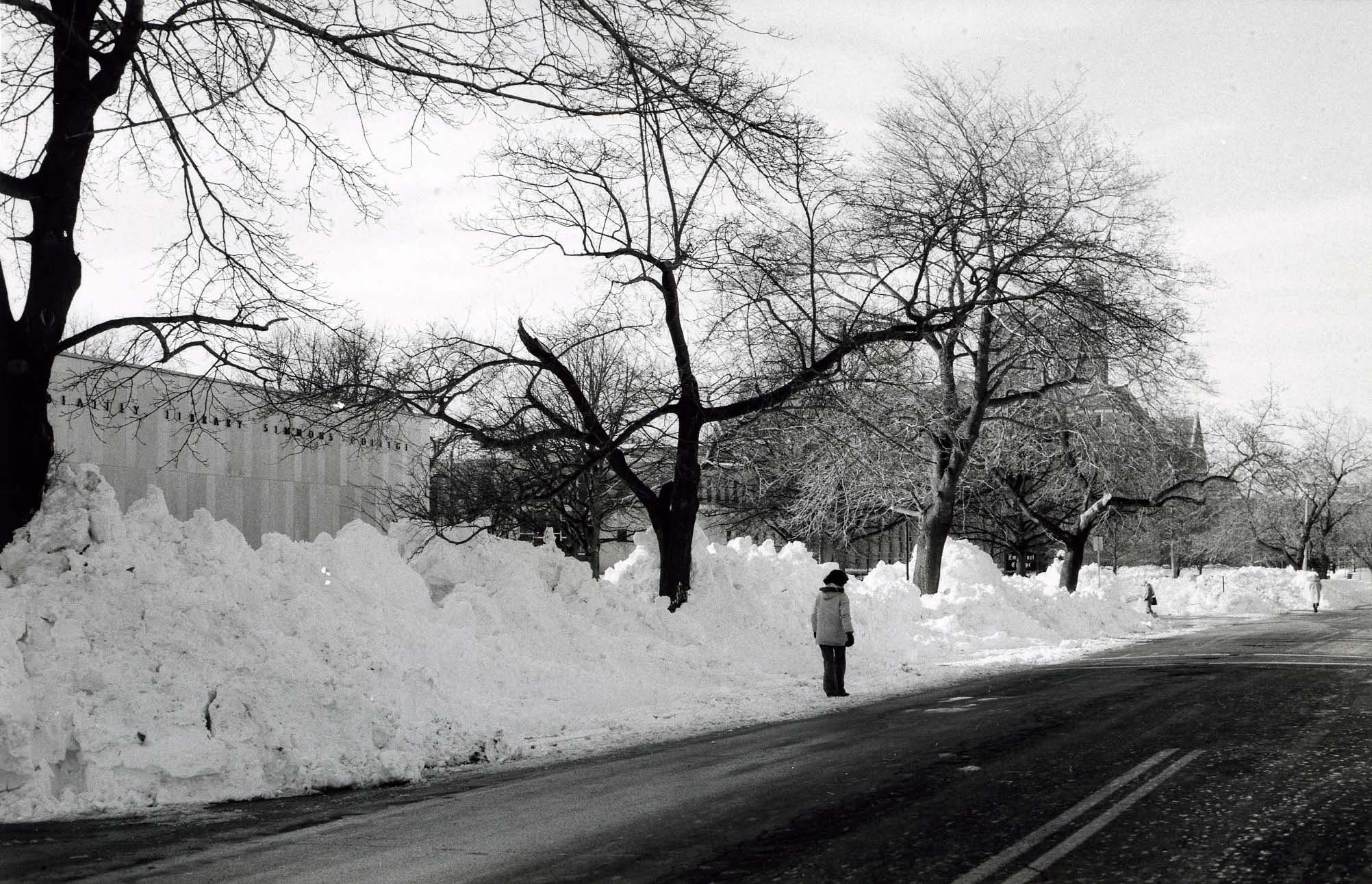 View of The Fenway in front of Beatley Library covered with snow after the northeastern blizzard of 1978.