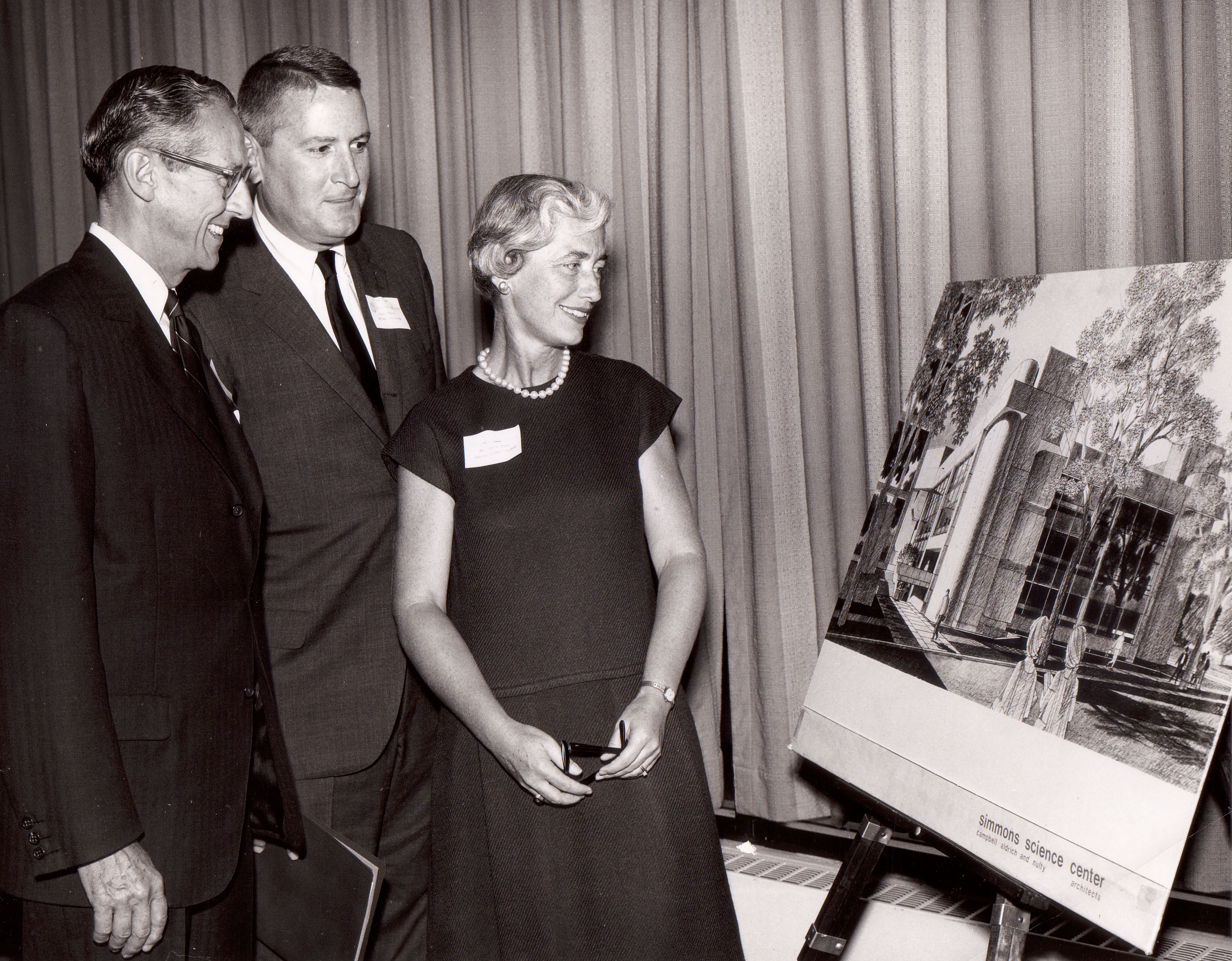 Duette Photographers, “Kathryn Wilson Moore, Class of 1941, with Colman Mockler Jr. and Franklin K. Hoyt during an architectural presentation of the new Science Center, circa 1970.,” Buildings@Simmons, accessed March 15, 2026, https://beatleyweb.simmons.edu/buildings/items/show/97.